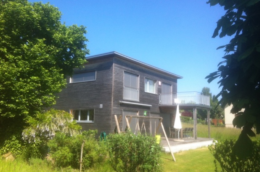 Dieses Einfamilienhaus ist im Jahr 2008 von Zili erstellt worden. Die Fassadenholz-Schalung der Aufstockung ist mit dem selben Holz ausgeführt worden wie der Bau von 2008. Die graue Färbung dieses Holzes (Lärche) ist ein natürlicher Witterungsschutz (ähnlich der Patina bei Kupfer). In wenigen Jahren wird die Aufstockung vom ursprünglichen Einfamilienhaus nicht mehr zu unterscheiden sein.